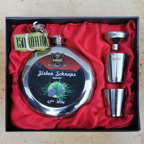 Original Zirbenschnaps 30% im formschönen Flachmann inklusive 2 Trinkgefäßen und Stöpsel. Wohl bekomms!
